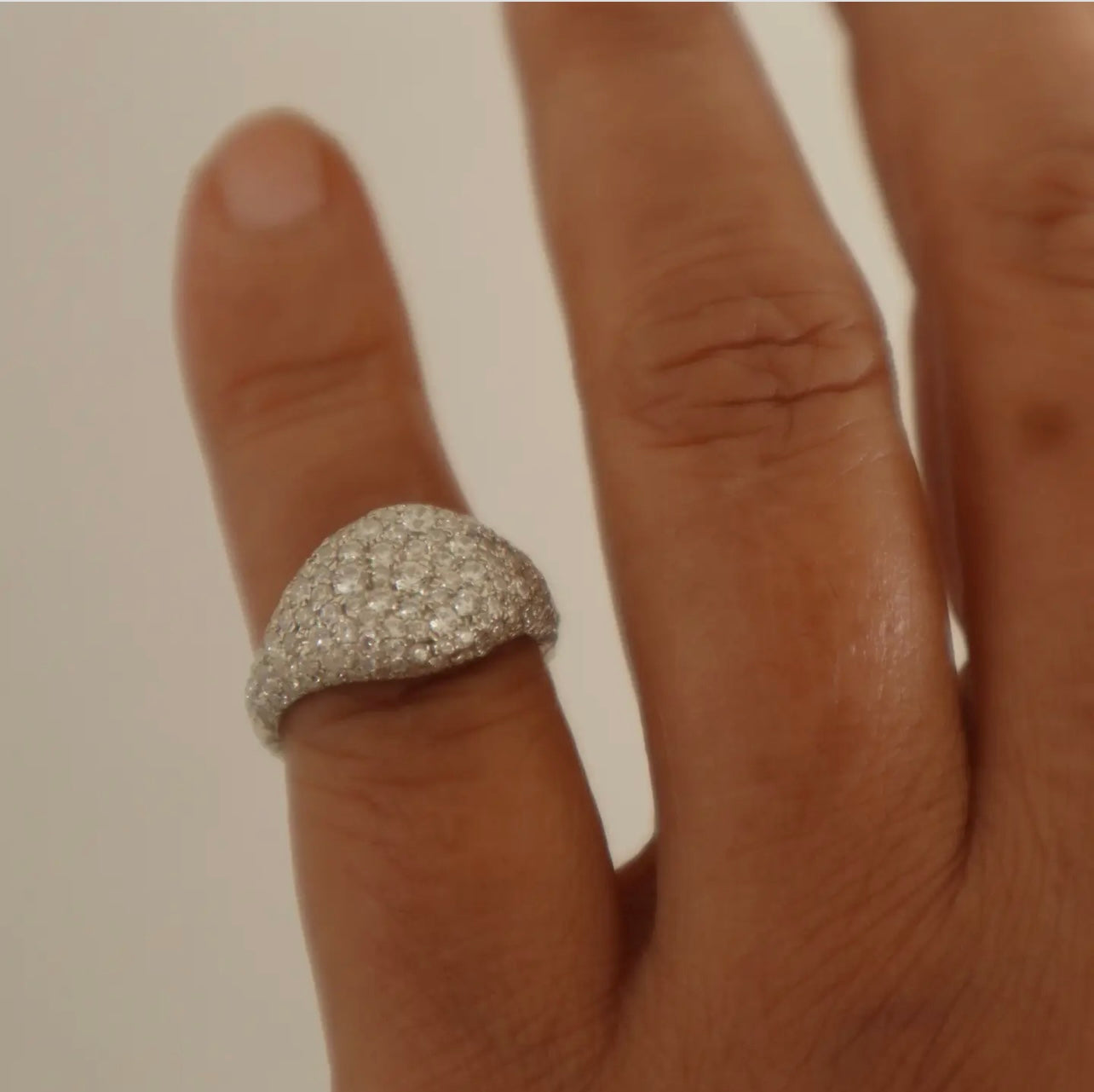 Elevate your jewelry display with this elegant pinky pavé dome ring, handcrafted in solid 925 sterling silver and fully encrusted with shimmering moissanite stones. Its low-profile dome silhouette makes it a perfect blend of understated glamour and everyday sparkle. Ideal for fine fashion boutiques and gift-driven collections, this ring is designed to shine on its own or as part of a curated ring stack.