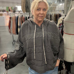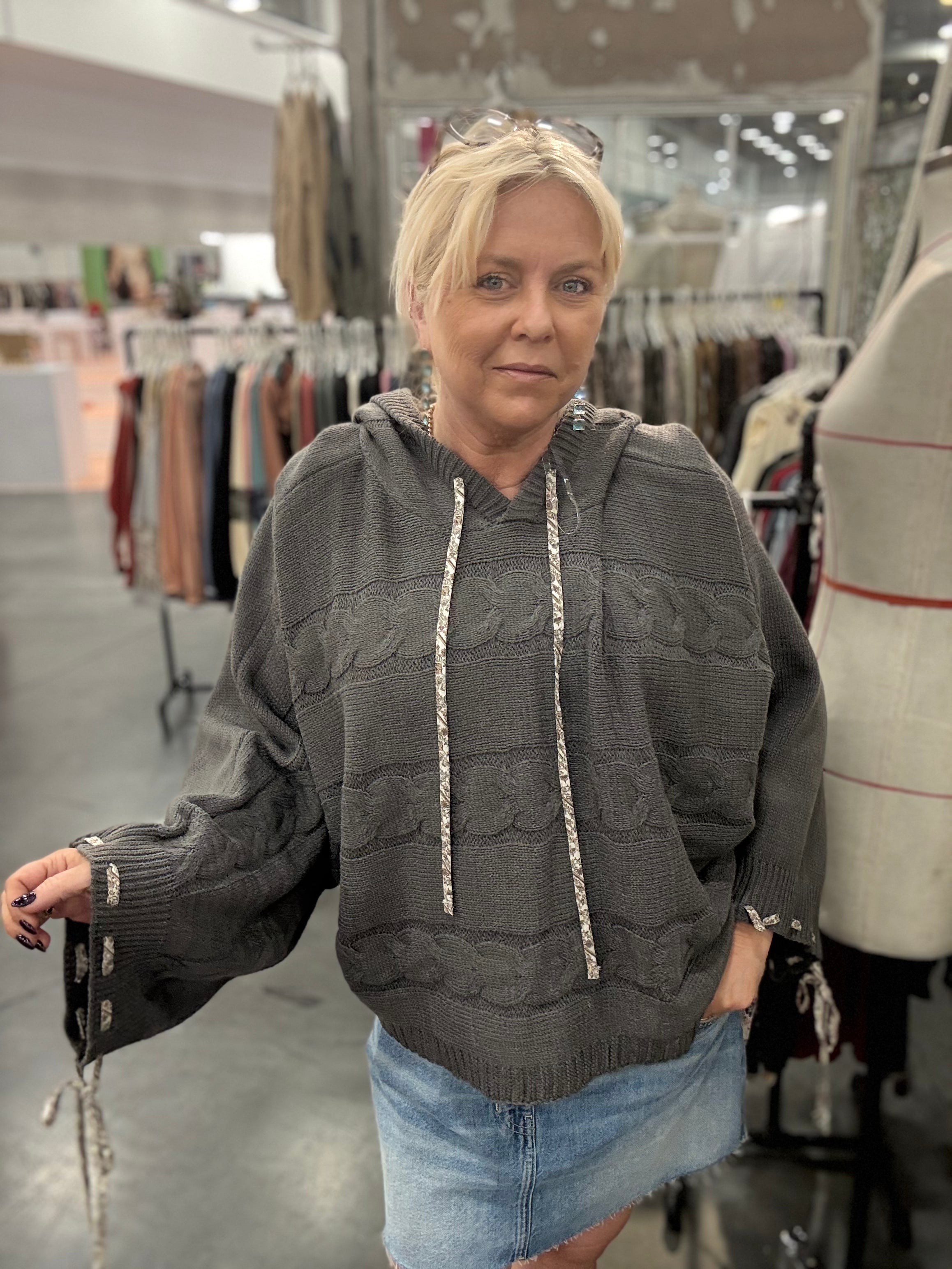 Introducing our cozy and stylish oversized hoodie, perfect for those laid-back days! Crafted from a soft, textured fabric in a chic charcoal hue, it features a unique cable knit pattern that adds a touch of elegance. The relaxed fit and wide sleeves provide ultimate comfort, while the decorative drawstrings and button details elevate its charm. Pair it effortlessly with your favorite denim skirt for a trendy, casual look. Stay warm and fashionable!