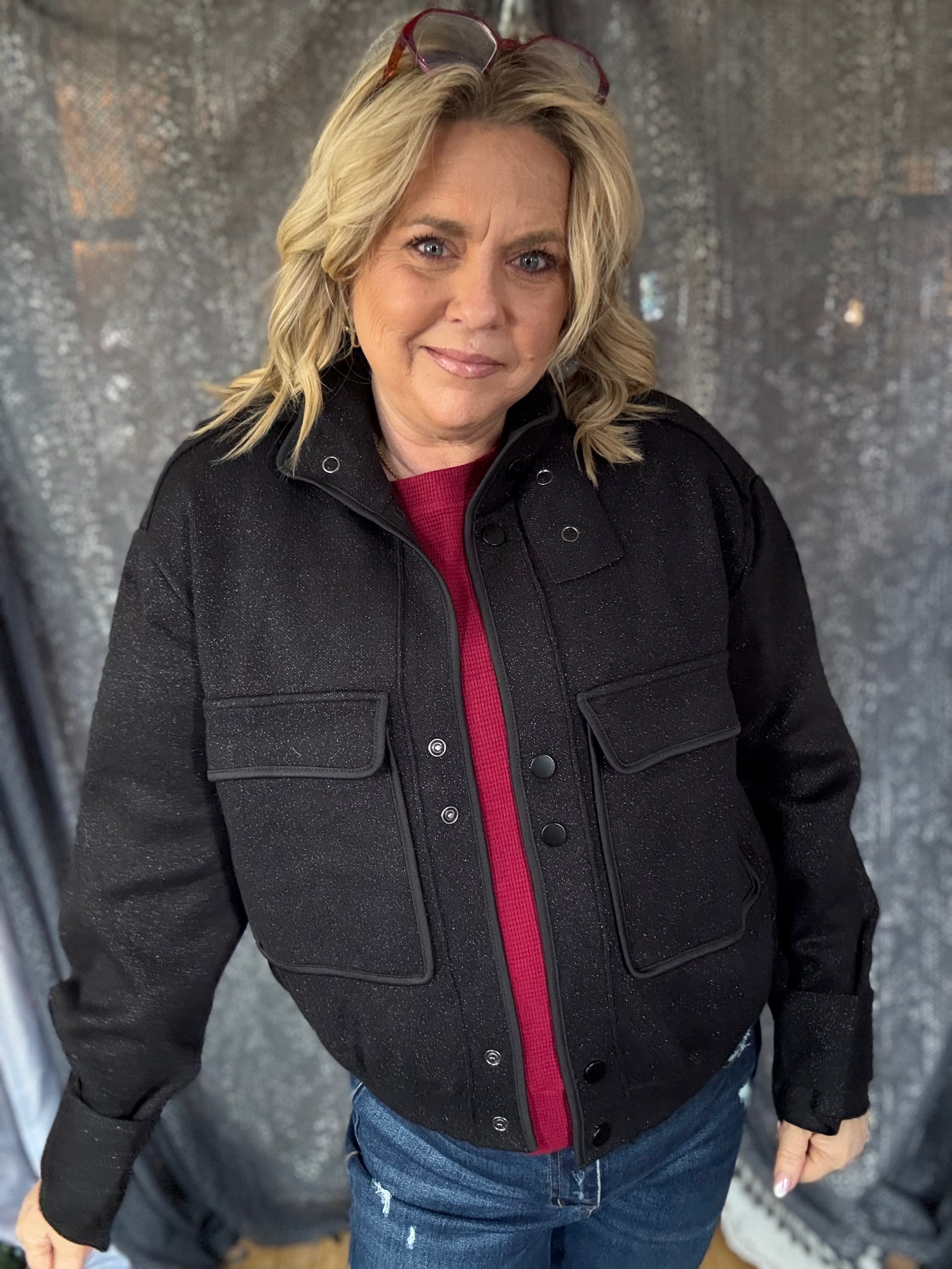 Make a bold statement with this versatile black utility jacket. Featuring a textured fabric with subtle speckled detailing, this cropped bomber-style piece combines edgy street style with refined sophistication. The structured collar, multiple flap pockets, and zip-front closure create a utilitarian aesthetic that's both functional and fashion-forward, while the relaxed fit and ribbed cuffs ensure all-day comfort.