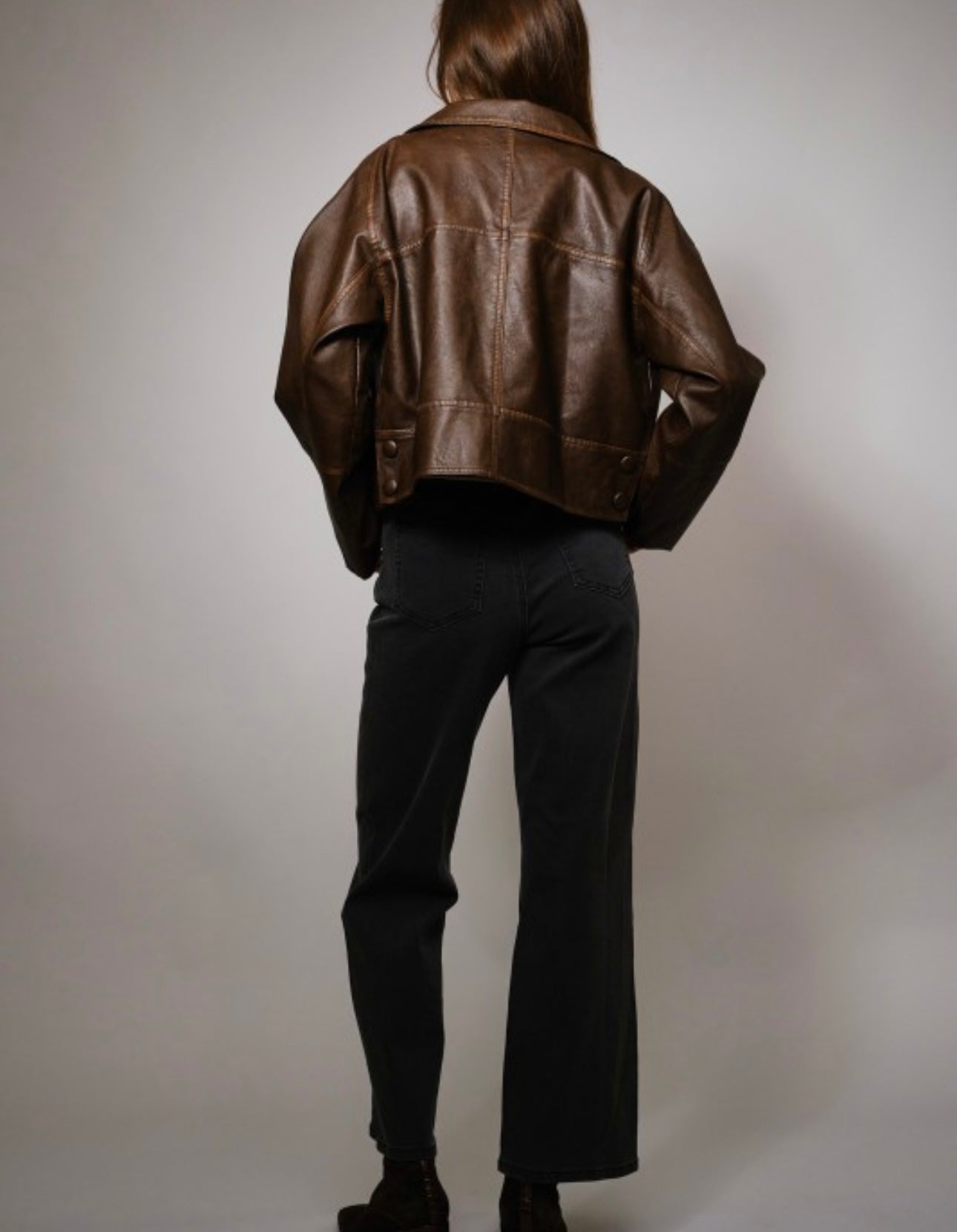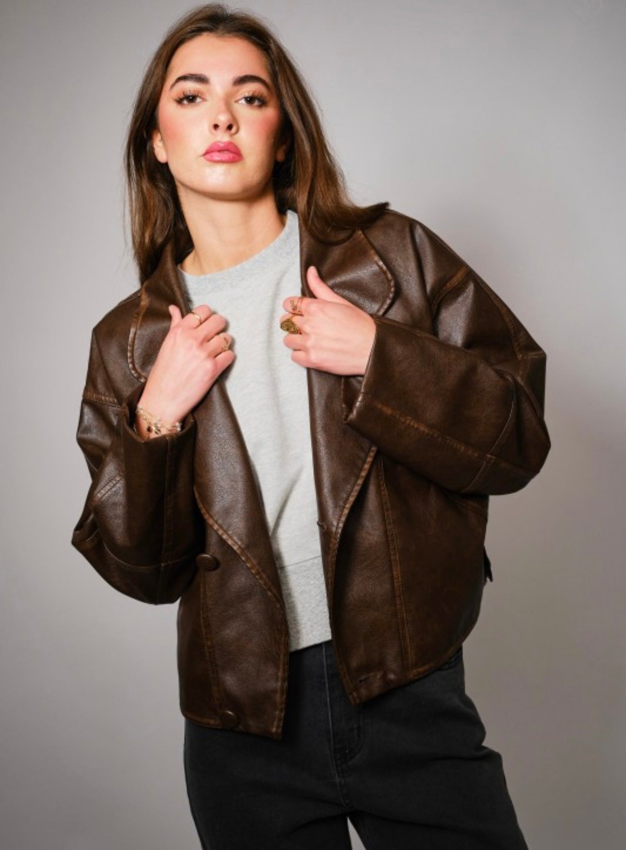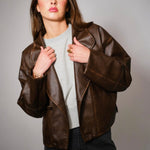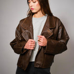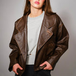 Embrace timeless style with this classic brown leather jacket. Crafted from rich, supple leather with a beautifully worn finish, this cropped moto-style jacket exudes vintage charm and modern edge. The structured collar, button-front closure, and functional chest pockets create a utilitarian aesthetic that pairs perfectly with any outfit.