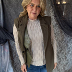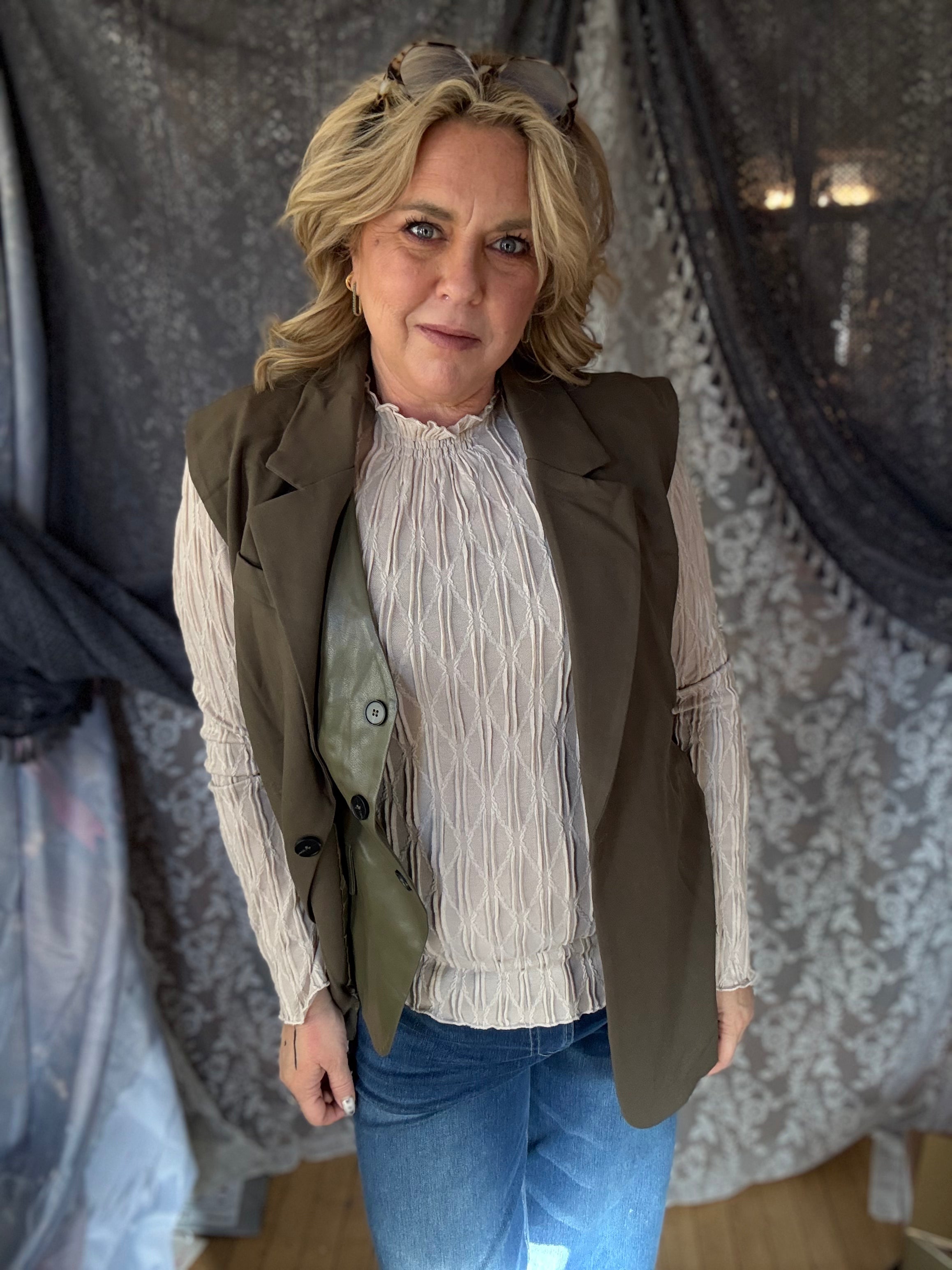 Introducing our stylish sleeveless blazer, perfect for adding a touch of sophistication to any outfit! Crafted from a soft, lightweight fabric in a chic olive green hue, this versatile piece features a classic lapel collar and a single button closure for a tailored look. With practical side pockets and a comfortable fit, it’s ideal for layering over a blouse or dress. Elevate your wardrobe with this trendy essential that effortlessly combines fashion and function!