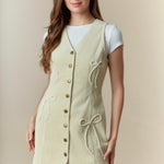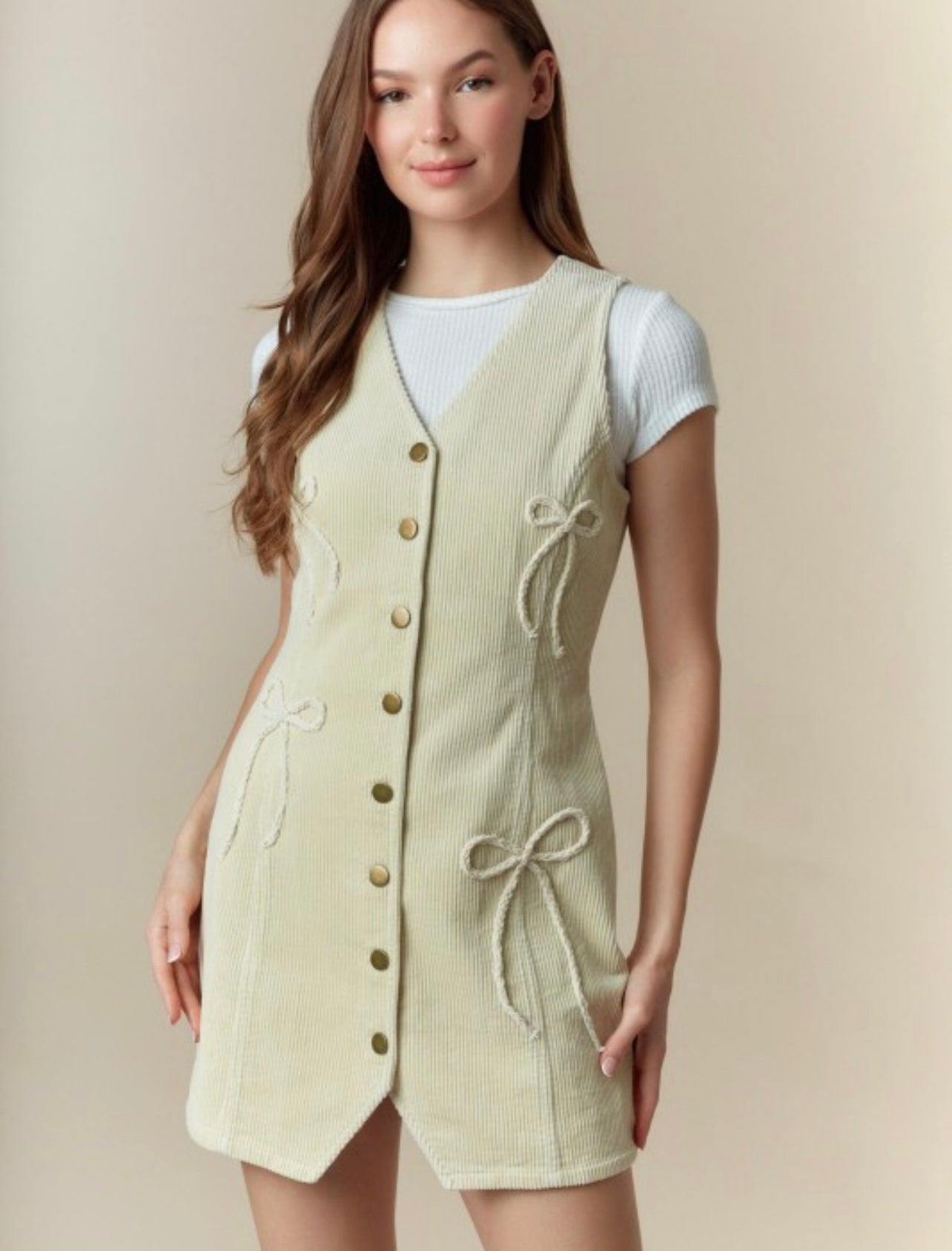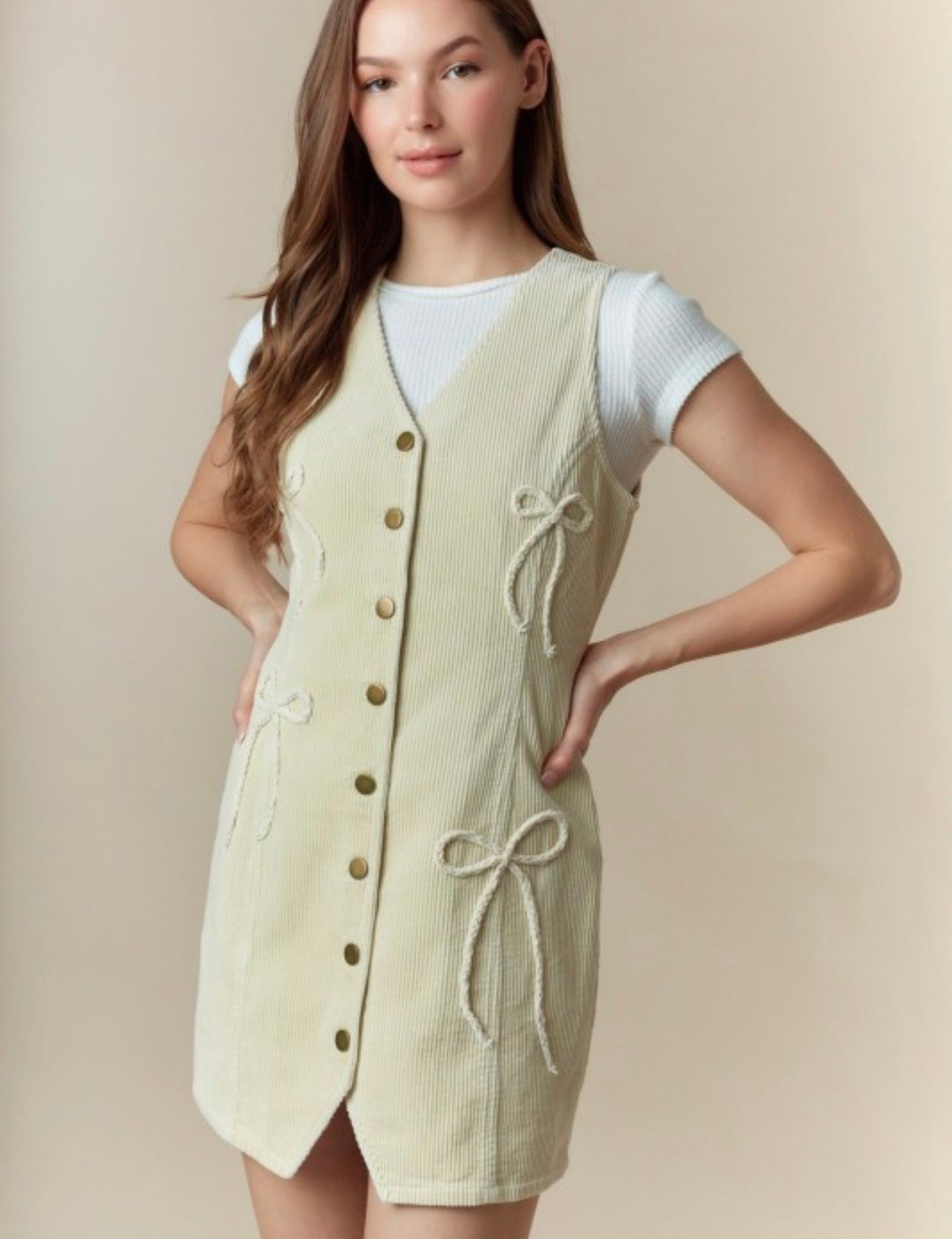 Introducing this charming sleeveless dress, perfect for sunny days! Crafted from a soft, textured fabric, it features a delightful button-down front and sweet bow details on the sides, adding a playful touch. The light cream color makes it versatile for any occasion, whether you're heading to brunch or a casual outing. With its flattering fit and easy-going style, this dress is sure to become a favorite in your wardrobe. Embrace effortless elegance!