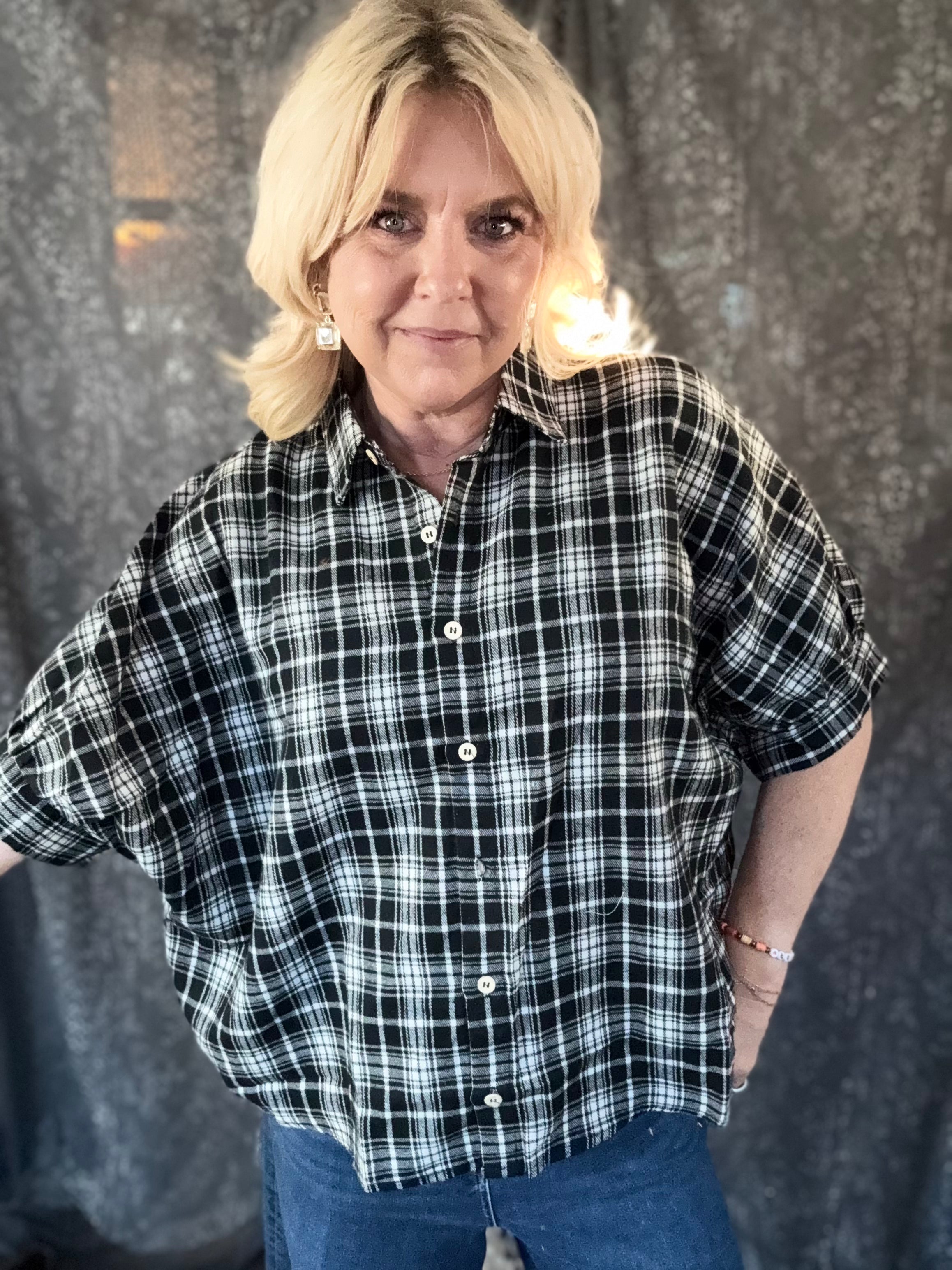 Introducing our stylish plaid button-up shirt, perfect for any casual outing! This shirt features a relaxed fit with short sleeves, making it a comfortable choice for warm days. The classic black and white plaid pattern adds a timeless touch, while the lightweight fabric ensures breathability. Pair it with your favorite jeans or a skirt for a chic look. Elevate your wardrobe with this versatile piece that combines comfort and style effortlessly!