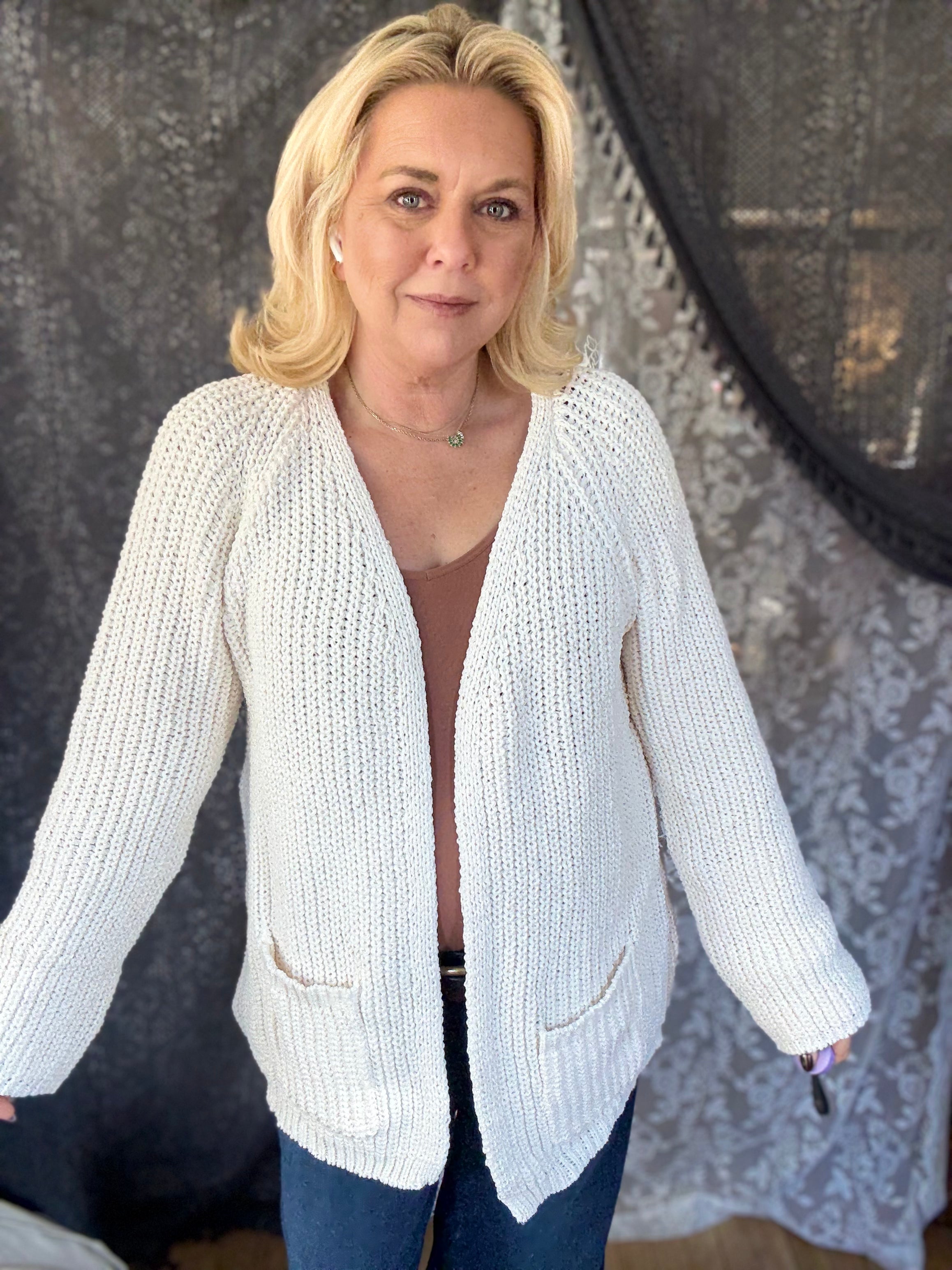 Introducing our cozy, cream-colored cardigan, perfect for layering! Crafted from soft, textured knit, it features a relaxed fit with charming pockets for added functionality. The open front design makes it easy to throw on over any outfit, while the lightweight fabric ensures comfort throughout the day. Whether you're heading out for a casual brunch or lounging at home, this cardigan is your go-to piece for effortless style. Embrace warmth and elegance!