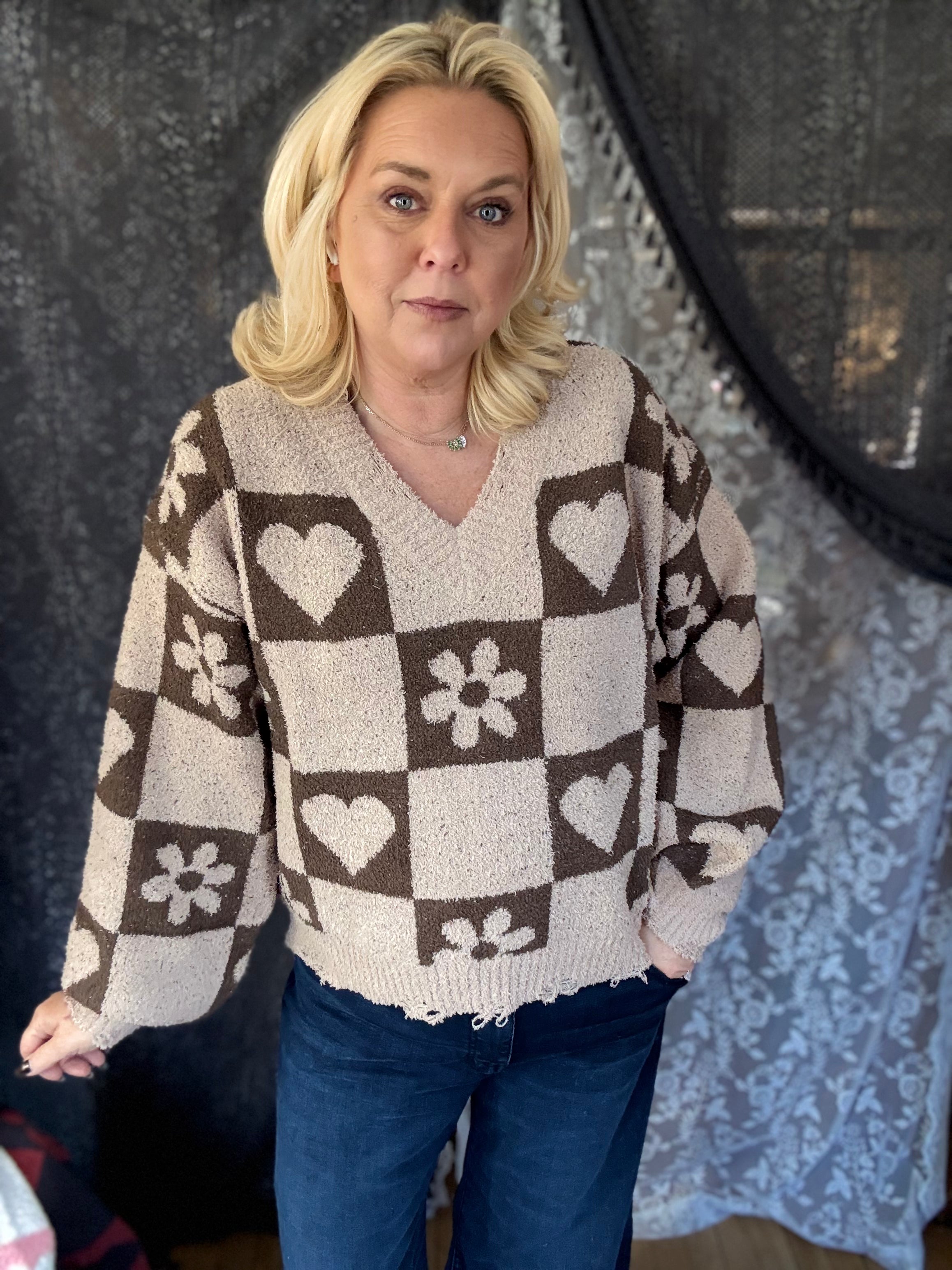 Introducing our cozy and stylish sweater, perfect for adding a touch of warmth to your wardrobe! This delightful piece features a charming patchwork design with playful hearts and flowers, all in a lovely beige and brown color palette. The relaxed fit and soft fabric ensure comfort, making it ideal for casual outings or cozy nights in. Pair it with your favorite jeans or lounge pants for a chic, laid-back look. Embrace the season in style!