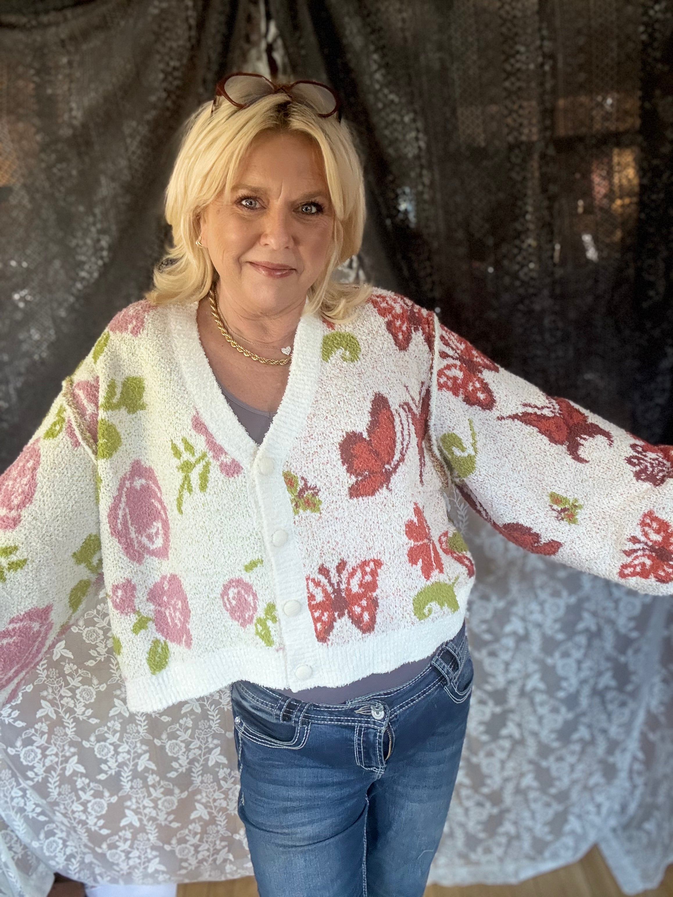 Embrace cozy vibes with this stunning floral cardigan! Crafted from soft, textured fabric, it features a delightful array of colorful butterflies and blooms that add a playful touch to your wardrobe. The oversized fit and button-down design make it perfect for layering over your favorite outfits. Pair it with relaxed trousers for a chic, bohemian look. Ideal for chilly evenings or casual outings, this cardigan is a must-have for effortless style!