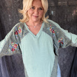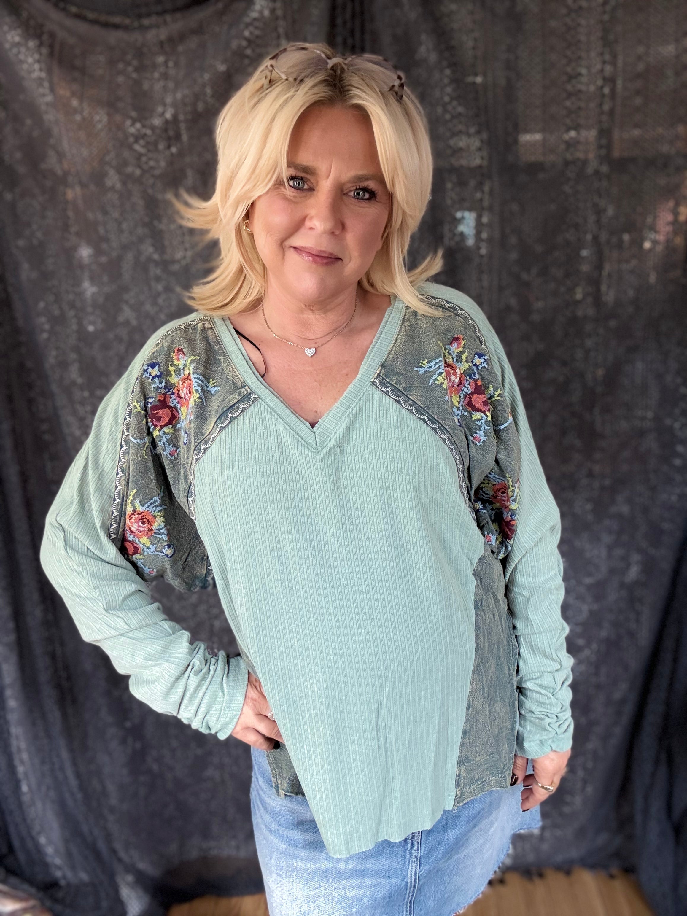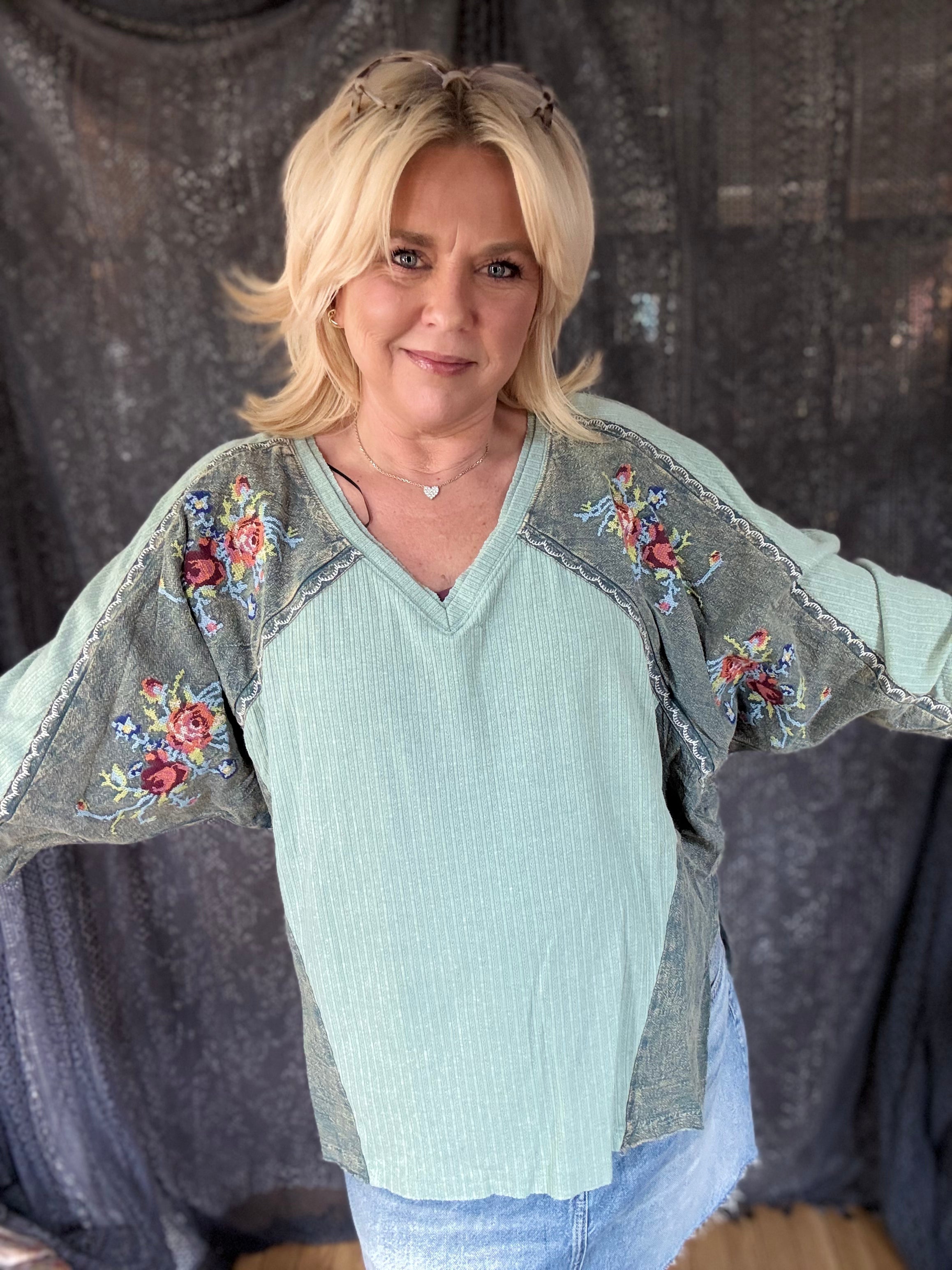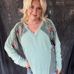 Step into style with this charming mint green top, perfect for any occasion! Featuring a cozy V-neck design, it boasts beautiful floral embroidery along the sleeves, adding a touch of elegance and flair. The lightweight fabric ensures comfort, making it ideal for layering or wearing solo. Whether you're out shopping or enjoying a casual day, this top is sure to turn heads and keep you feeling fabulous! Embrace your unique style with this delightful piece!