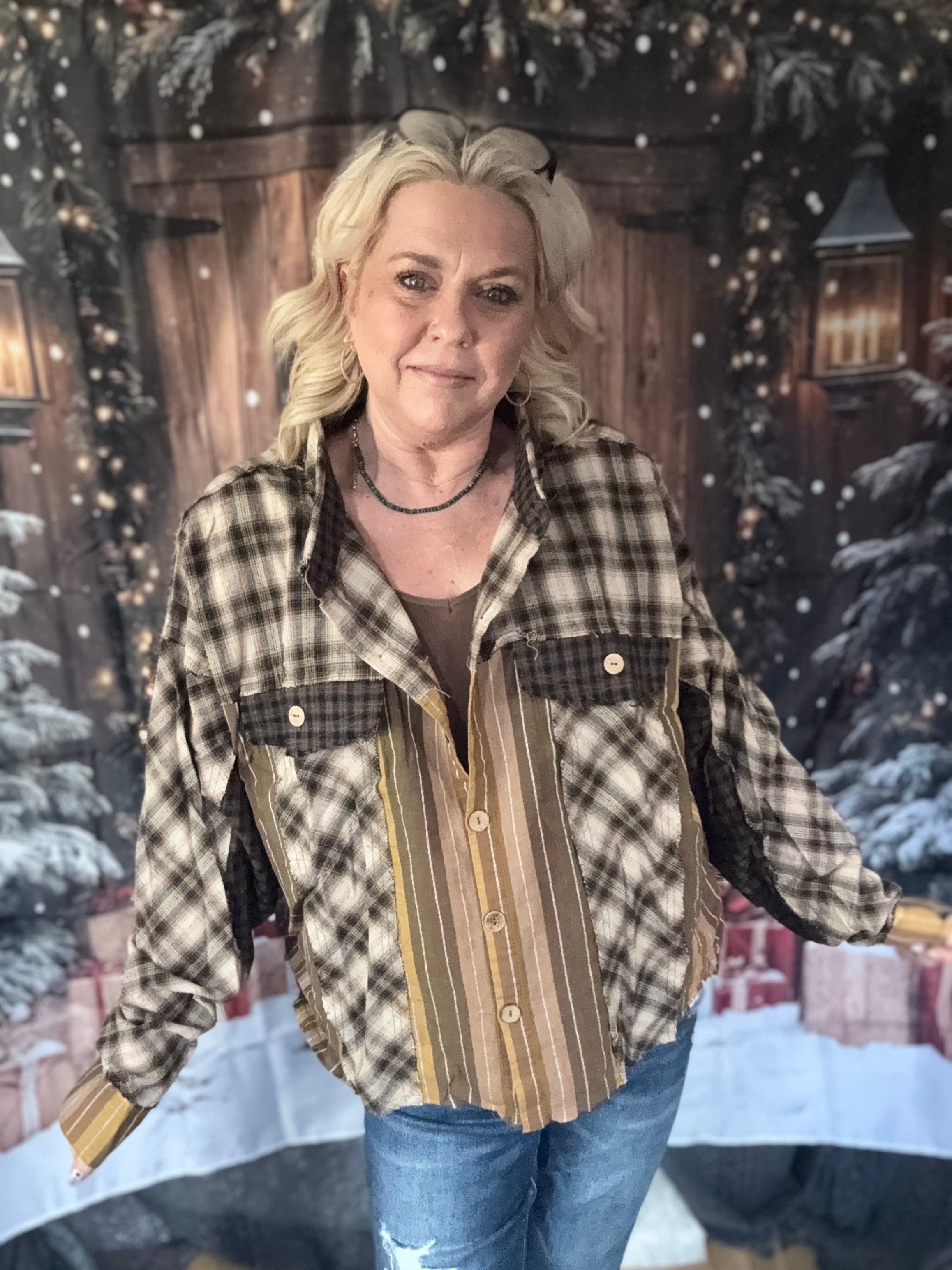Step into style with this chic plaid shirt! Featuring a unique blend of earthy tones and a trendy oversized fit, this shirt is perfect for layering or wearing solo. The button-up design adds a touch of sophistication, while the contrasting stripes bring a playful twist. Pair it with your favorite jeans or a sleek skirt for a versatile look that transitions effortlessly from day to night. Embrace comfort and fashion in one fabulous piece!